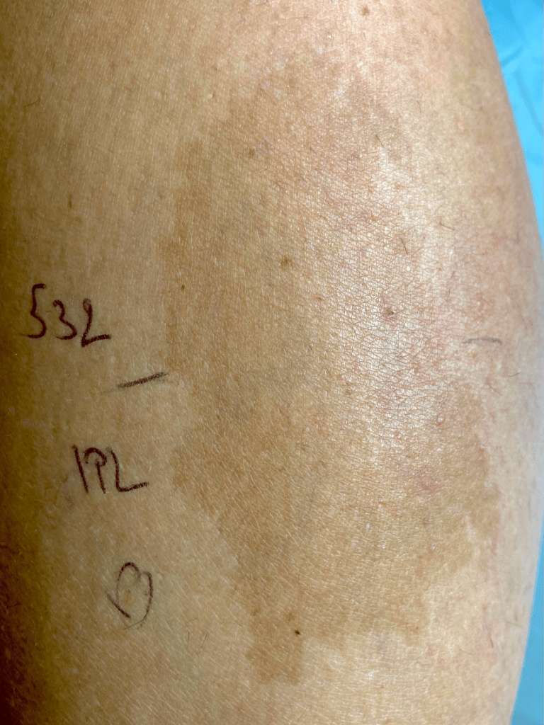 The first treatment was done on 26.10.21. I applied a fluence of 2 J/cm2 in a 532nm beam. This photo shows the immediate reaction following treatment by the YAG laser. The melanosomes have absorbed the laser energy which has generated steam bubbles on their surfaces. The whitening reaction is the result of these steam bubbles. This photo was taken before we applied the IPL beam to the lower half.