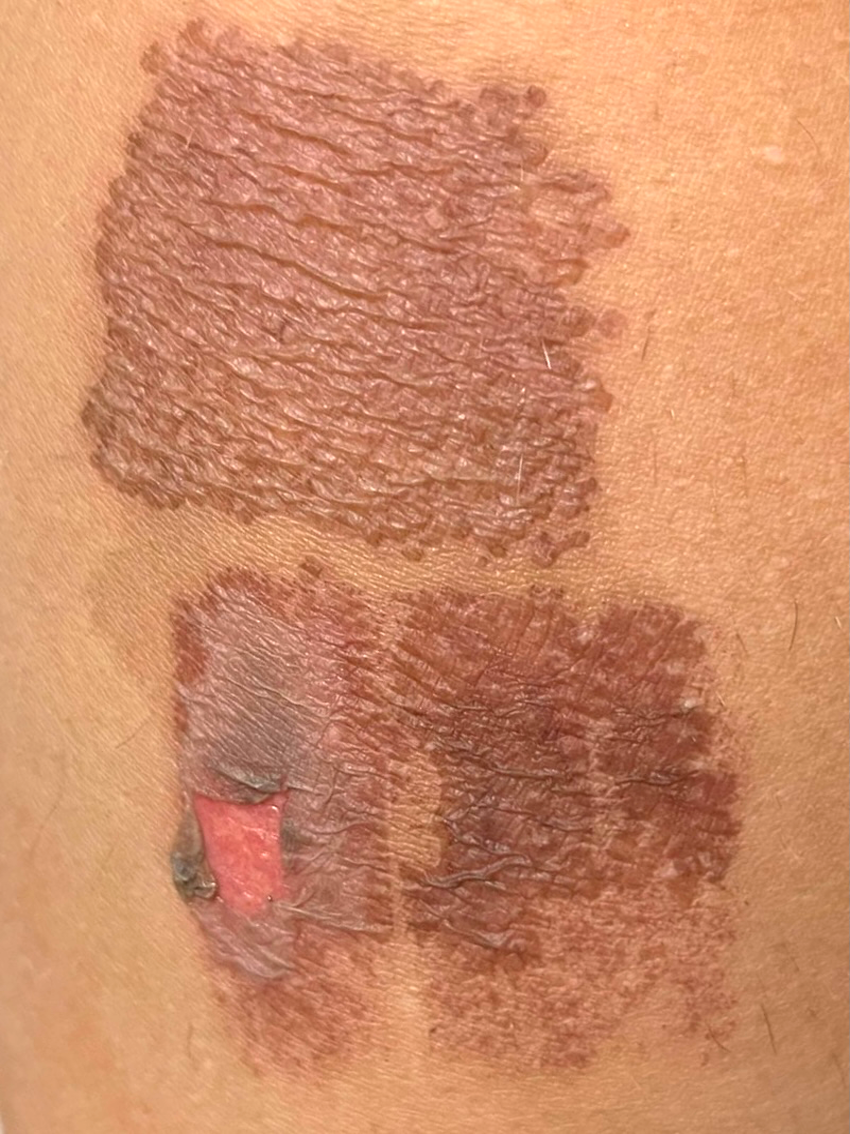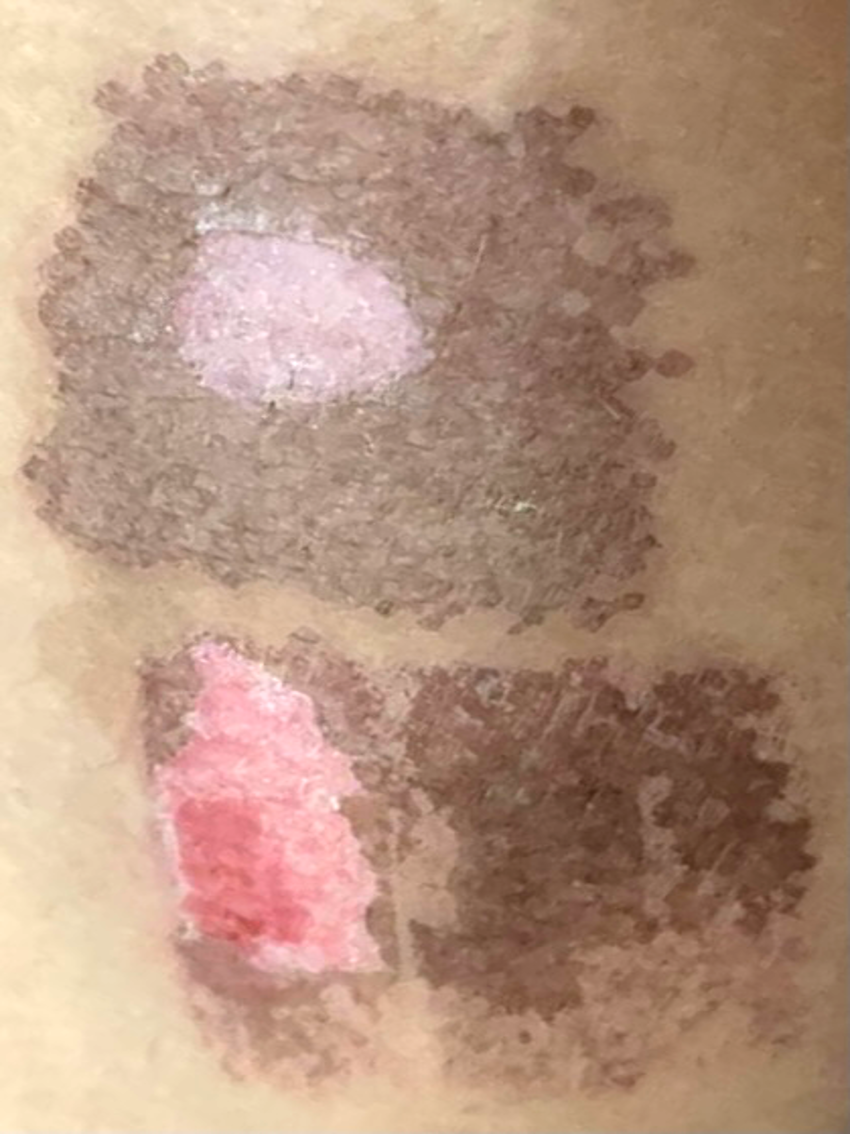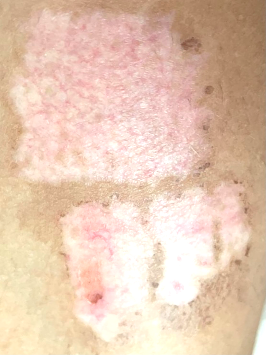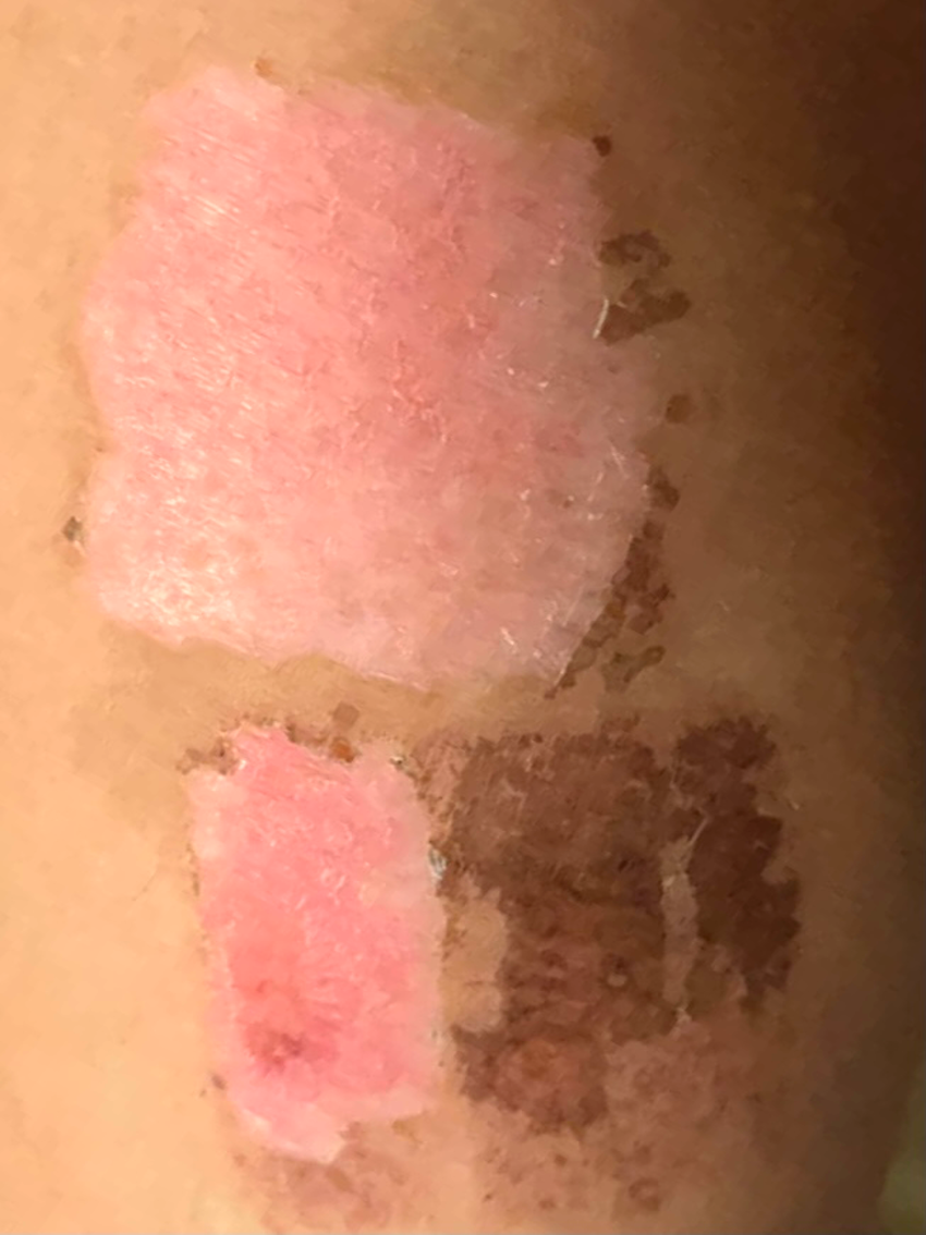 On 1.11.21 we can see that both areas appear quite similar and that the blistered tissue is beginning to fall off the skin, exposing the underlying dermis.