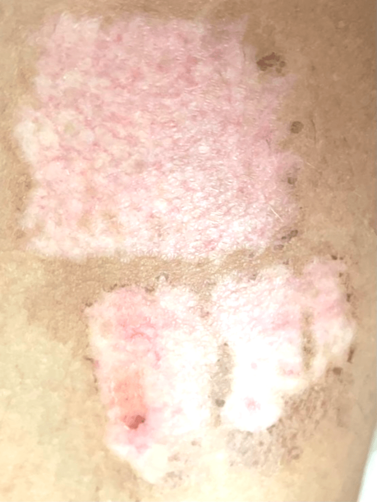 A few days later (11.11.21) and we can clearly see the areas that we ‘missed’ in the treatments. The dermis is now looking very healthy and most of the blisters have finally gone.