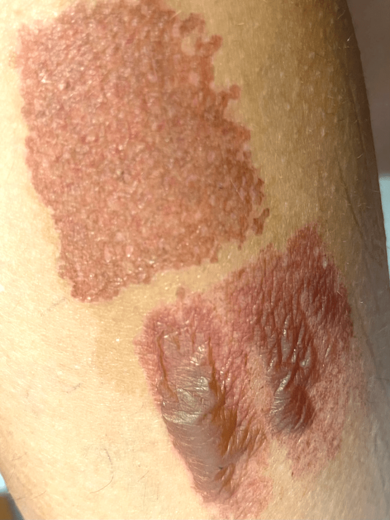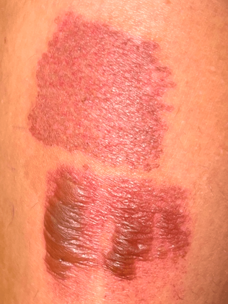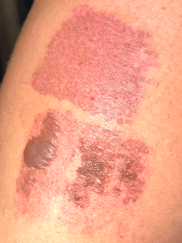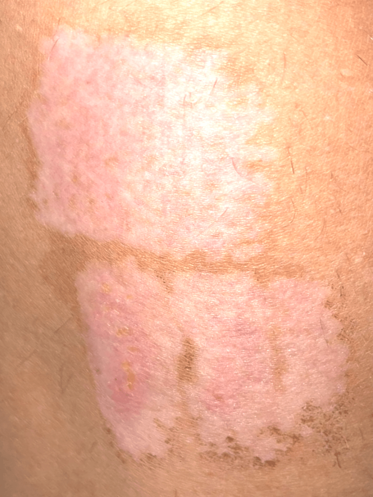 Above is 3.11.21 – 7 days post-treatment. Most of the dead surface tissue has fallen away from the skin in the YAG treated area, while it is beginning to fall away from the IPL treated area below. The underlying dermal tissue appears to be in good condition with no significant signs of damage.