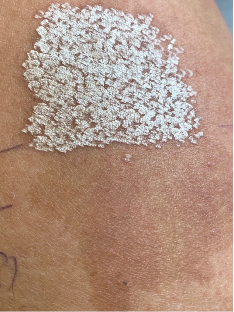 On the following day (29.10.21) the blisters in the IPL area have increased in size. Now the skin looks like it has been ‘burnt’. The patient said that the blisters were “a bit sore and makes sitting a little uncomfortable.”