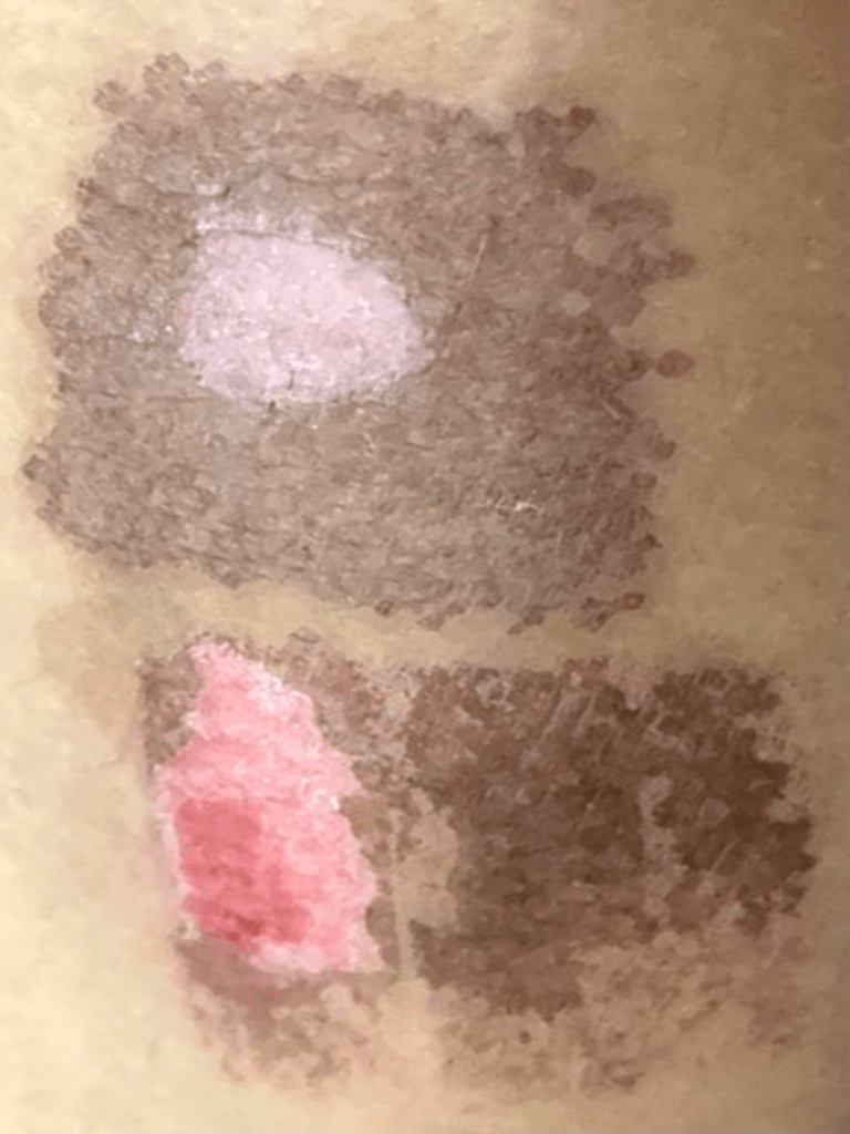 Here we can clearly see two different reactions to the treatments. The upper area has turned a red colour – this is primarily due to the damage to the capillaries induced by the strong absorption of the 532nm wavelength.