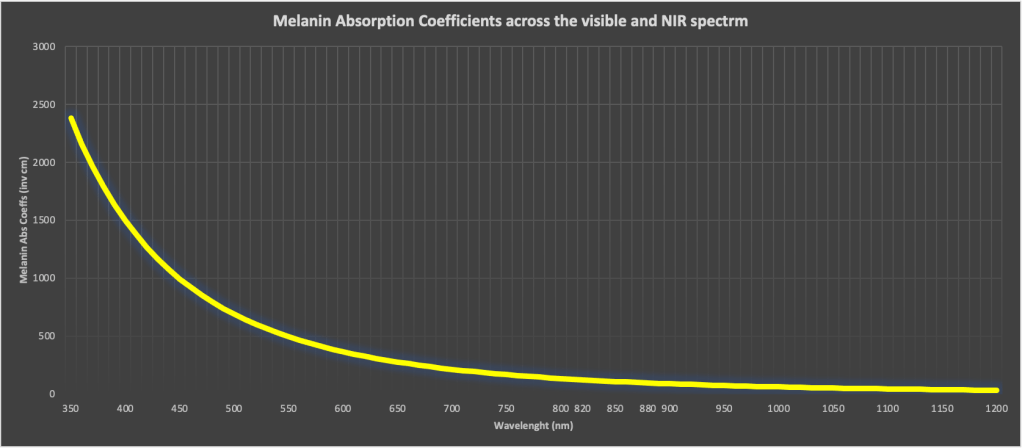 The above graph shows how melanin absorbs light in the visible and near infra-red parts of the spectrum. As we can see, there is much more absorption in the blue end of the spectrum (350 to 450nm). This is to be expected since melanin strongly absorbs ultra-violet and blue light to minimise cellular damage in the dermis.