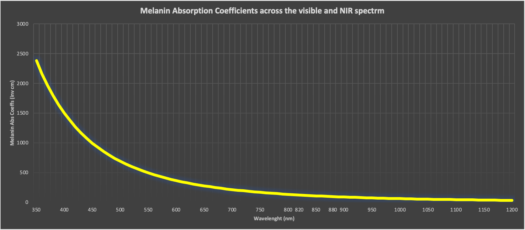 The above graph shows how melanin absorbs light in the visible and near infra-red parts of the spectrum. As we can see, there is much more absorption in the blue end of the spectrum (350 to 450nm). This is to be expected since melanin strongly absorbs ultra-violet and blue light to minimise cellular damage in the dermis.