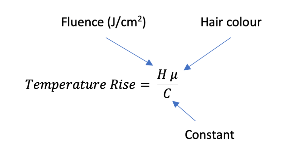 So, this equation is telling us that the temperature rise generated by laser energy absorbed in any target is simply dependent on the product of the fluence and the ‘colour’. This makes sense – darker hair are easy to remove compared with lighter hairs.
