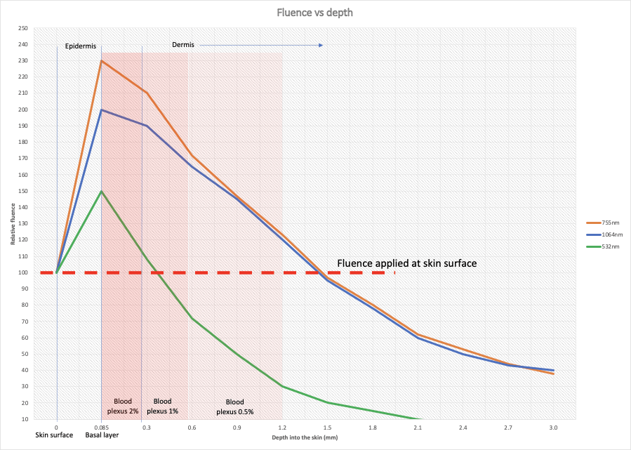 What it actually means is, that if an initial fluence of, say, 10 J/cm2, is applied to the skin surface, then it will reach a maximum value of 23 and 20 J/cm2 for 755nm and 1064nm, respectively, at the top of the dermis.