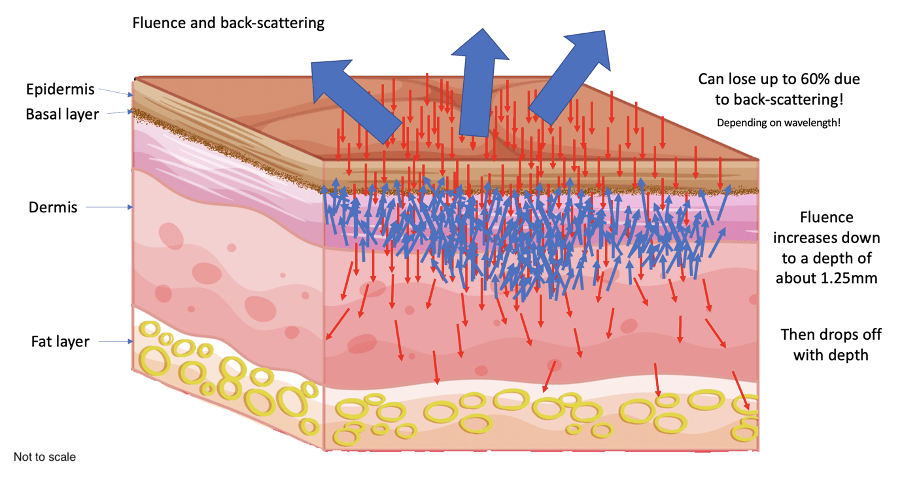 Monte-Carlo simulations reveal that this increase in fluence can extend as far as 1.4mm into the skin. This means that the fluence applied at the skin surface will increase down to a depth of 1.4mm, then will drop rapidly due to absorption and scattering.