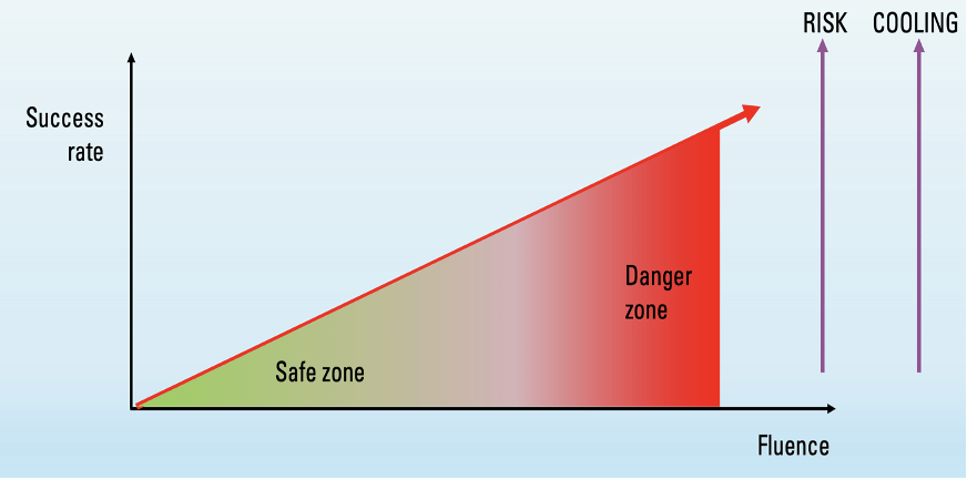 The whole reason for cooling the skin is to lower the temperature of the thermal pain nerves, located just below the epidermal/dermal junction. By doing so, they will not trigger until their temperatures is raised above 45ºC – this will require more fluence if they are pre-cooled by 10 or 15ºCelsius.