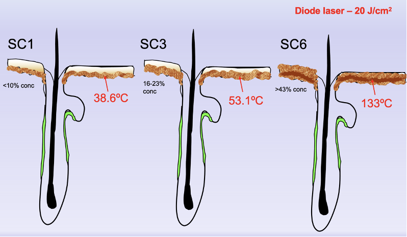 This means that the resultant temperature rise in the germ cells will be much greater compared with the epidermal melanin, depending on the skin colour and hair depth.