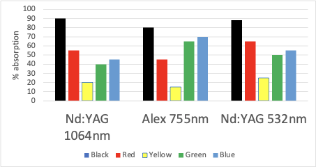 Another excellent study by Choi et.al. (Effects of picosecond laser on the multi-colored tattoo removal using Hartley guinea pig: A preliminary study.) looked at the relative responses in coloured tattoo inks to three wavelengths (532, 755 and 1064nm) from both nanosecond and picosecond lasers. We can use the results from this study to give an indication of the relative absorptions of these coloured inks.