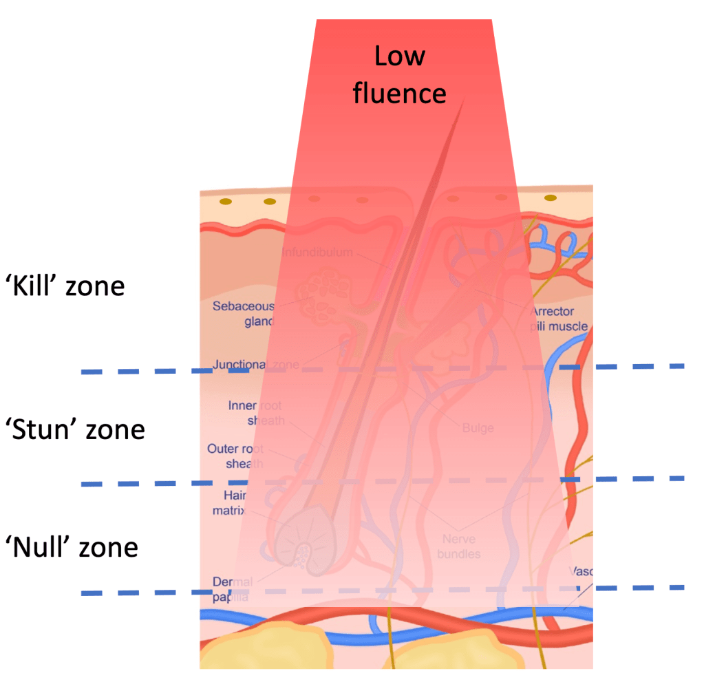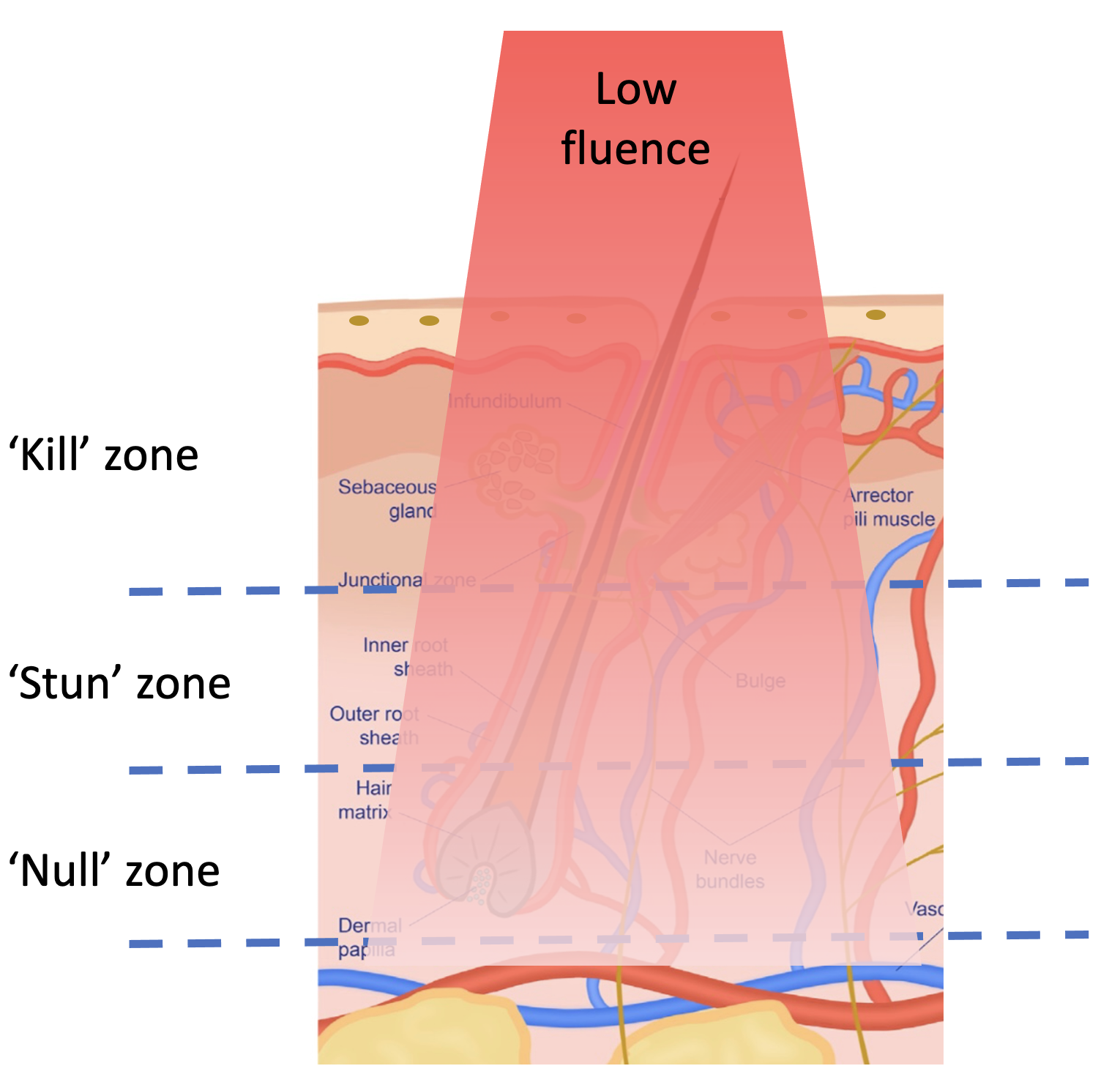 Clearly, this ‘low’ fluence will not kill all the follicles since the energy reaching the deeper hairs is just too low. So, we need to increase the fluence to push down the depth of the kill zone (see image below).