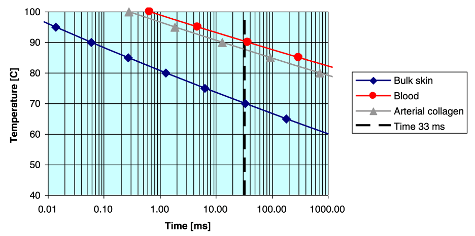 In collagen proteins (in the skin), a 70°C temperature must be maintained for at least 35 milliseconds (ms) to thermally destroy the proteins to a point where they cannot regenerate.