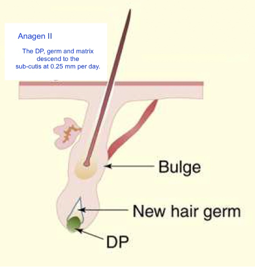 | Anagen II – A brief period when the germ grows down around the DP and the first keratinisation, the internal sheath, begins. DP and germ begin to descend at around 0.25mm per day. |