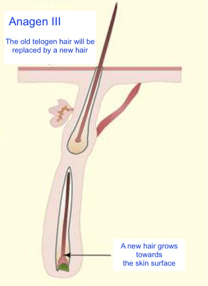 There is a fourth phase – exogen. During this period the hairs shed – either by being ‘pushed’ out by new, growing hair, or by physical friction on the skin surface. The anagen phase can coincide with the exogen phase, for a significant time.