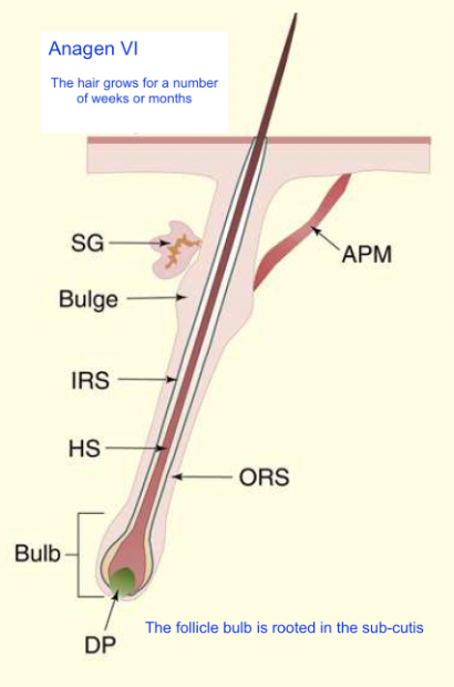 | Anagen VI – HS emerges through epidermis and continues to grow for the duration of anagen. |