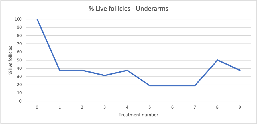 Then there is not much change in the overall number of live, visible follicles until after session 4, where the percentages drop from around 40 to 20. After session 7, we see a rise in the number of live, visible follicles – the percentage jumps back up to nearly 50%!!