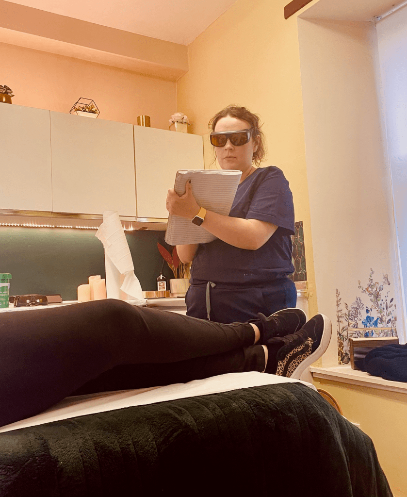 We are delighted to announce that our very first VTCT Level 4 ‘Laser and Light’ trainees, Kate and Tracey, passed their assessments and exams in our centre in Glasgow, yesterday. This is our first foray into this world of VTCT stuff and, I think, we did quite well. Special thanks to my lovely daughter, Lisa, who did all the heavy lifting. (I just made coffees and cracked ‘dad’ jokes…)
