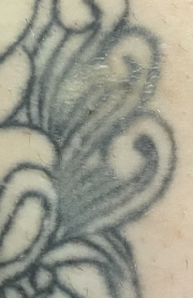 I found that this had happened to one of our clients – Amy, from Arbroath in Scotland, who agreed to let me show you her tattoo. She had received some diode laser treatment to her leg hair. Unfortunately, the laser operator got just a bit too close to her tattoo.